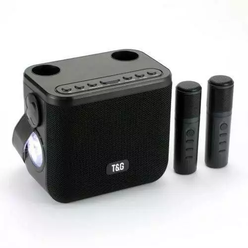 - Комплектация: колонка, кабель для зарядки, аудио кабель, инструкция на английском языке, 2 беспроводных микрофона