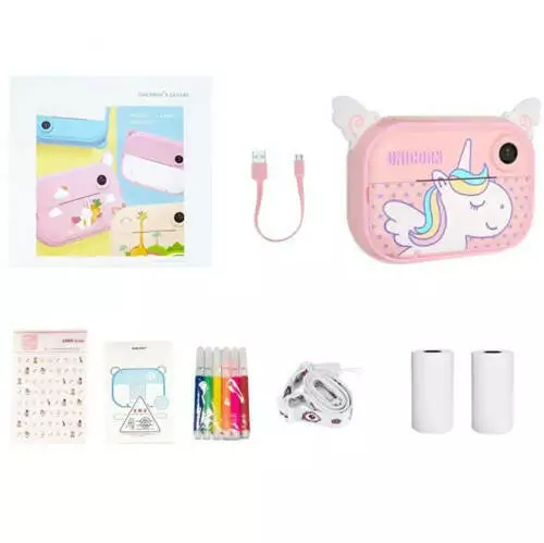 Дитячий фотоапарат оснащений 2 камерами: фронтальною камерою та селфі-камерою. Фотокамера дитяча з принтером - це моментальний друк простих чорно-білих фото. Саме з моментальним друкуючим принтером та фото виходить прямо з фотоапарата, як чек на касі в супермаркеті. Друк фото здійснюється за технологією термодруку, для якої не потрібне чорнило. Це означає, що фотоапарат нічим заправляти не треба. У комплект входять кольорові фломастери, за допомогою яких дитина перетворить просте фото на захоплююче забарвлення. Фотоапарат може використовуватися як звичайний фотоапарат навіть коли термопапір закінчиться. Усі його функції зберігаються, а термопапір можна придбати додатково. Прилад моментального друку працює від вбудованого акумулятора на 1500 мАг. Є можливість використання картки пам'яті (у комплекті не передбачено). Фотоапарат може працювати без застосування картки пам'яті для моментального друку. Великий кольоровий екран