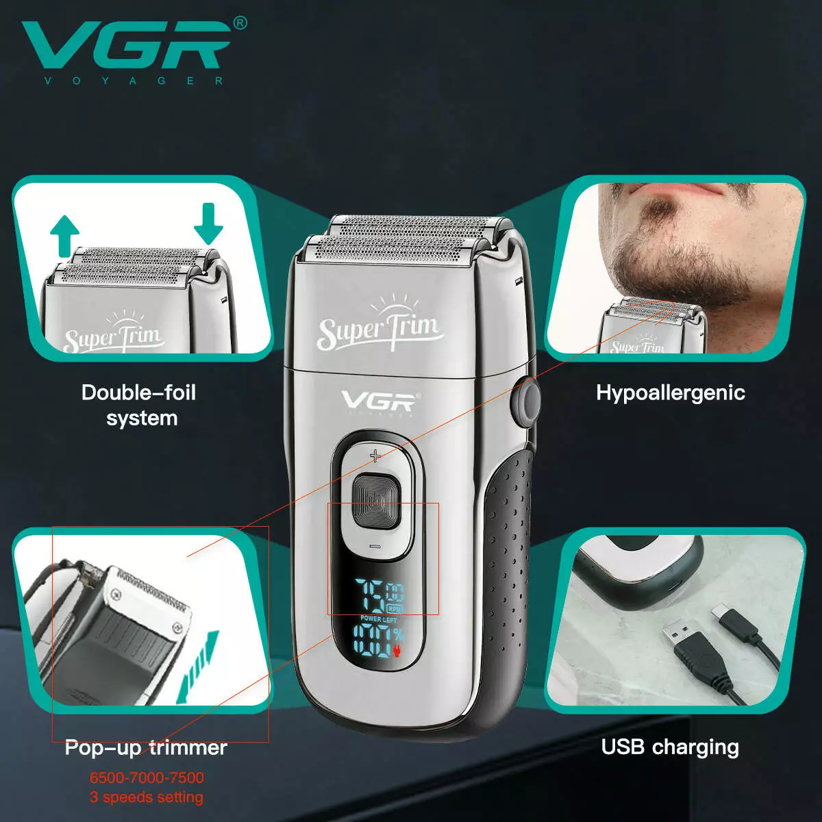 Електробритва VGR V-332 SILVER шейвер, подвійне лезо, тример, LED Display