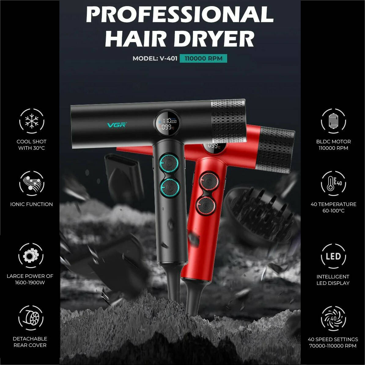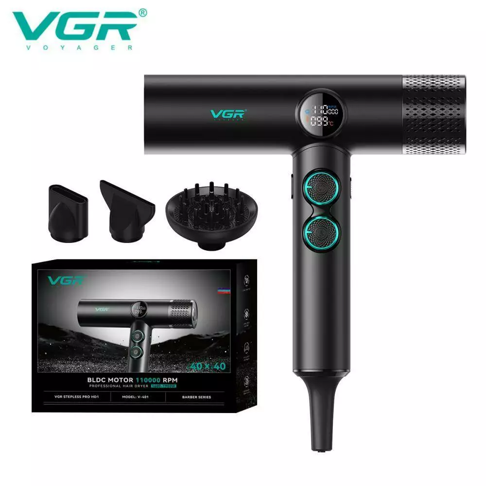 Фен професійний VGR V-401 BLACK, 40 рівнів обдування 70000 - 110000 RPM, 40 рівнів температури 60°C - 100°C, 3 насадки