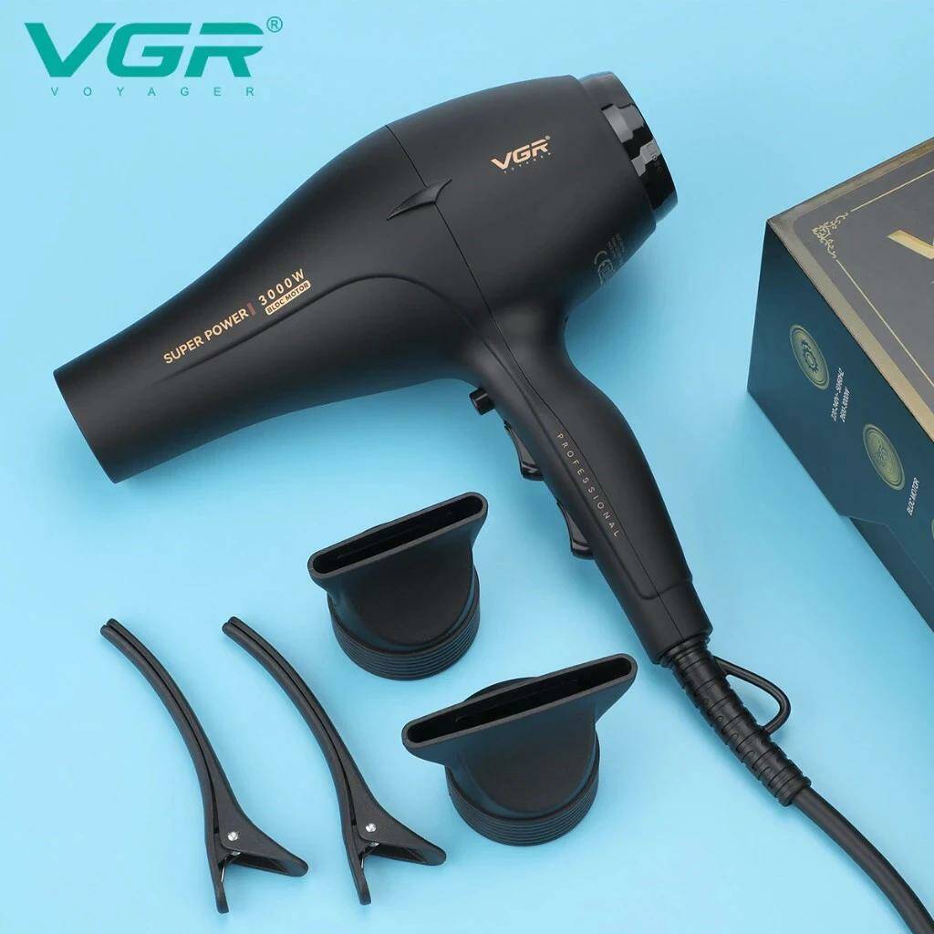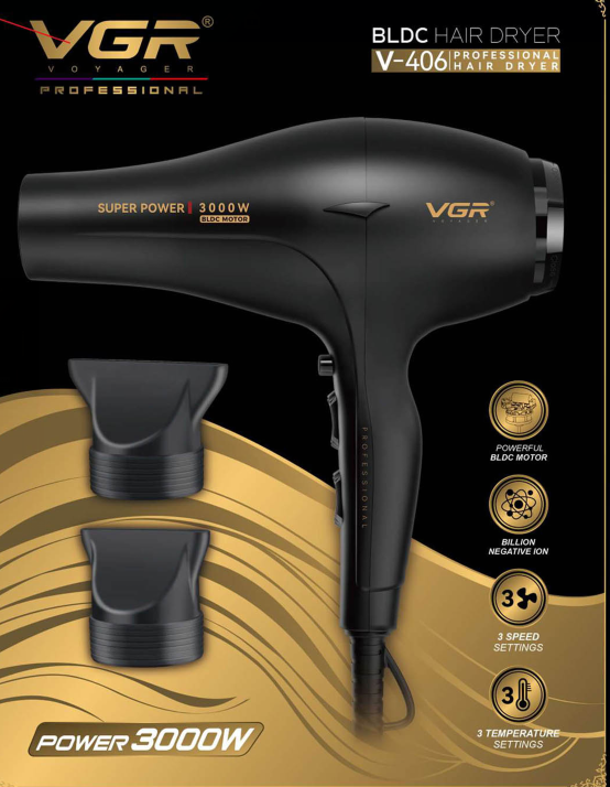 - Название (укр.): Фен професійний VGR V-406 BLACK, 3 рівні обдування, 3 рівні температури, 3 насадки, 3000 Вт