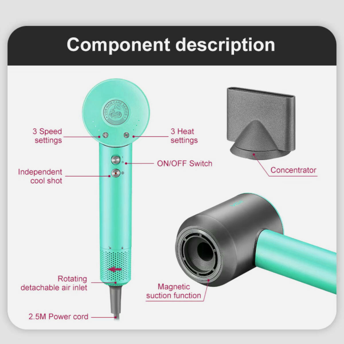 - Режими роботи: 3 рівні обдування та 3 рівні температури для індивідуального налаштування під тип волосся та бажаний ефект.