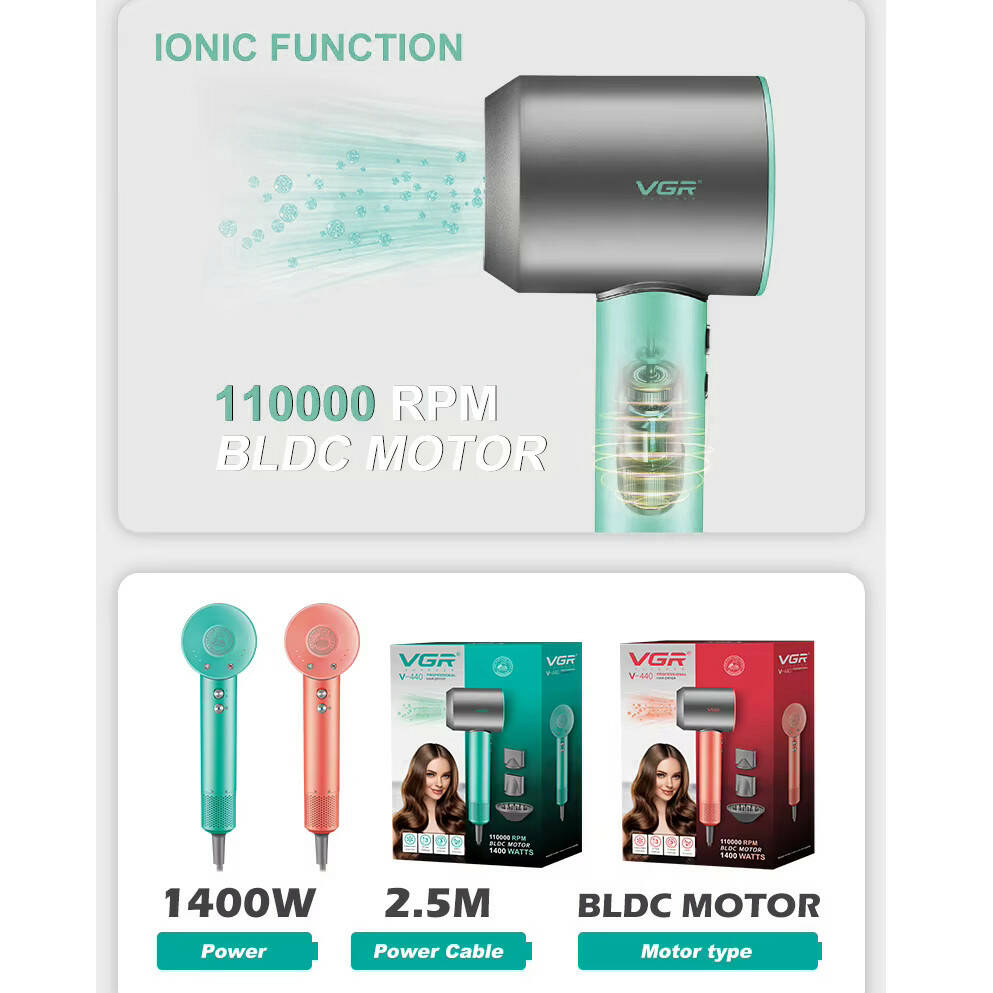 Фен професійний VGR V-440 GREEN, 3 рівні обдування, 3 рівні температури, 110000 RPM, 3 насадки