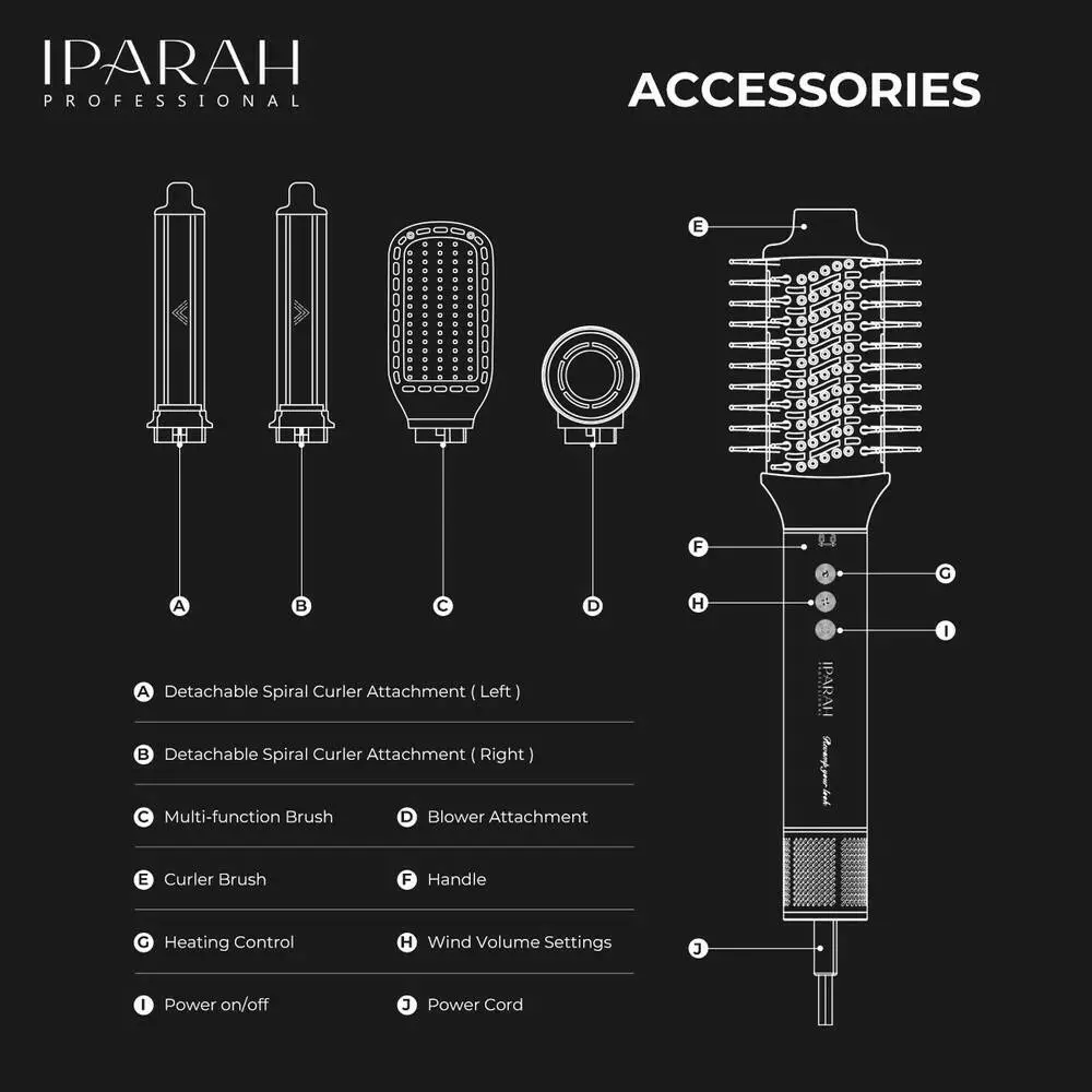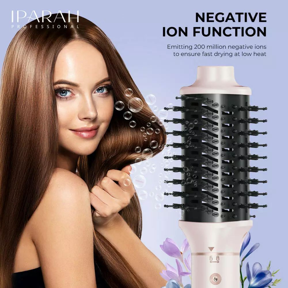 Багатофункціональний стайлер-фен IPARAH P-505 5-в-1 Multi-Styler With Hot Air Brush - це універсальний прилад для створення різноманітних зачісок та укладання волосся. Він поєднує функції фена, щітки-стайлера, випрямляча і двох насадок для завивки, дозволяючи сушити, випрямляти, формувати локони і надавати об'єм з одним пристроєм. Безщітковий мотор BLDC забезпечує потужний повітряний потік і високу швидкість обертання (≈105 000 об/хв), що скорочує час сушіння та допомагає досягти професійних результатів. Регульовані рівні температури і швидкості обдування дозволяють підібрати оптимальні параметри під різні типи волосся, а технологія іонізації робить волосся гладкішим і зменшує статичну електрику. Комплект включає 5 змінних насадок, завдяки яким можна легко змінювати стилі та створювати зачіски різної складності.