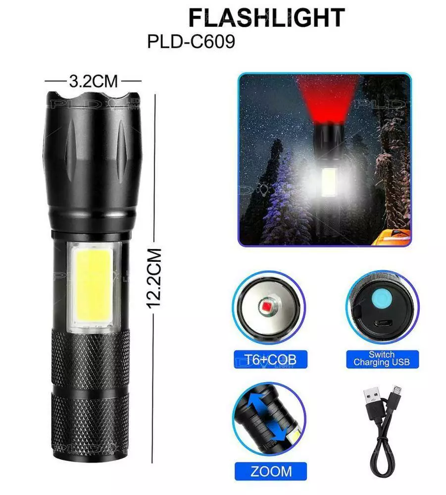 Ліхтар C609-T6(red)+COB(white), Li-Ion акум., ЗУ microUSB, zoom, Box