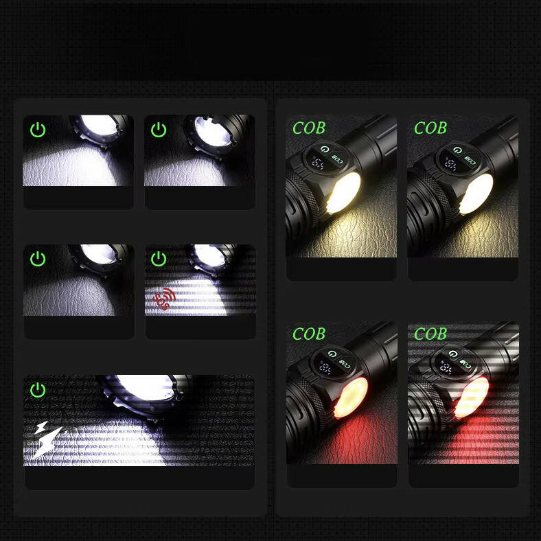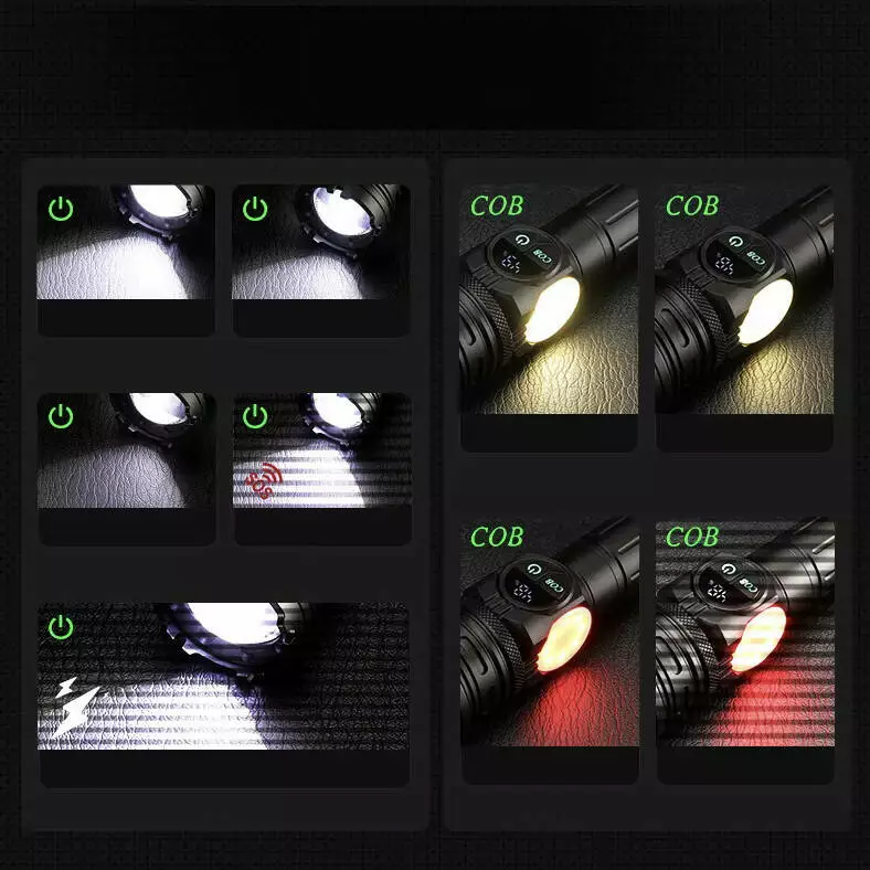 - Количество режимов работы: 9 (100% TG, 750% TG, 50% TG, стробоскоп TG, SOS TG, 100% white COB, 50% white COB, 100% red COB, стробоскоп red COB)