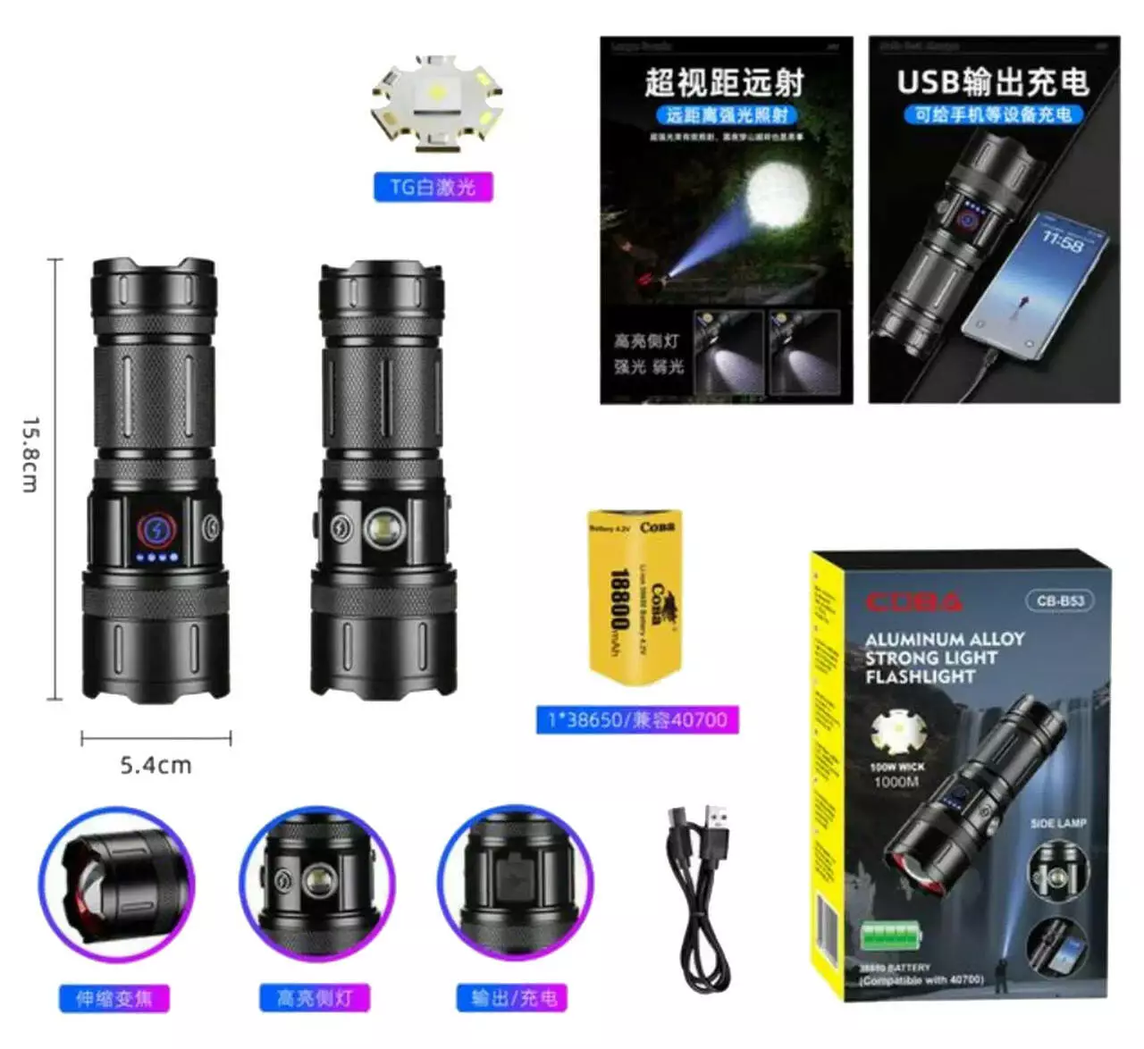 Ліхтар CB-B53-TG, 3х18650, Power Bank, індикація заряду, ЗП Type-C, zoom, Box