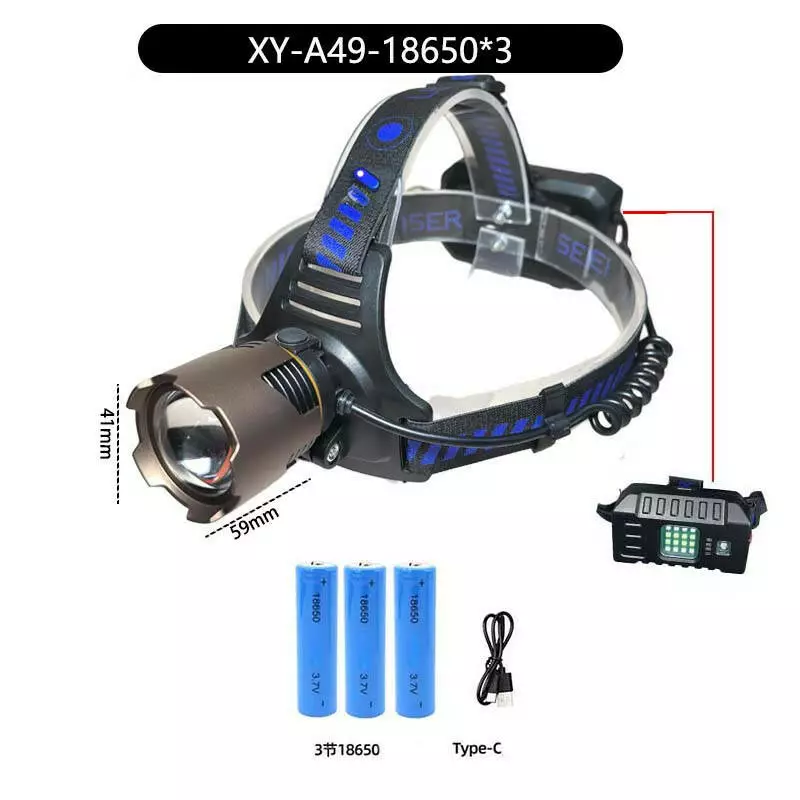 Ліхтар налобний A49-TG, Power Bank, 3x18650, ЗП Type-C, zoom, Box
