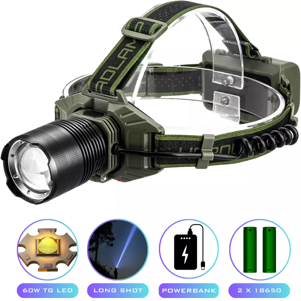 Ліхтар налобний CT023-TG-60W, Power Bank, 2x18650, ЗП Type-C, zoom