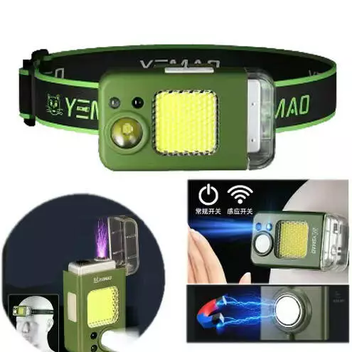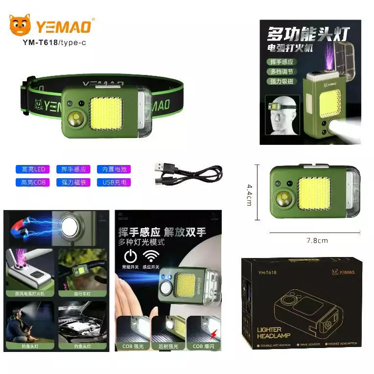 Ліхтар налобний MULTIFUNCTIONAL YEMAO YM-T618-LED+COB, Motion Sensor, Li-Ion акум., запальничка, ЗП Type-C, Box