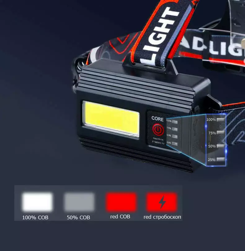 - Дополнительные характеристики: флуоресцентная окраска, индикация заряда, регулируемый угол наклона головы фонаря, signal light