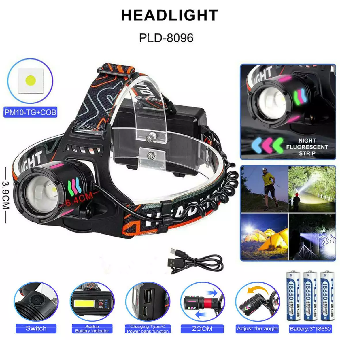 Ліхтар налобний NIGHT VISION FLUORESCENCE 8096 1 РЕЖИМ WHITE LASER LED PM10-TG+COB, 3x18650, Power Bank, ЗП Type-C, zoom