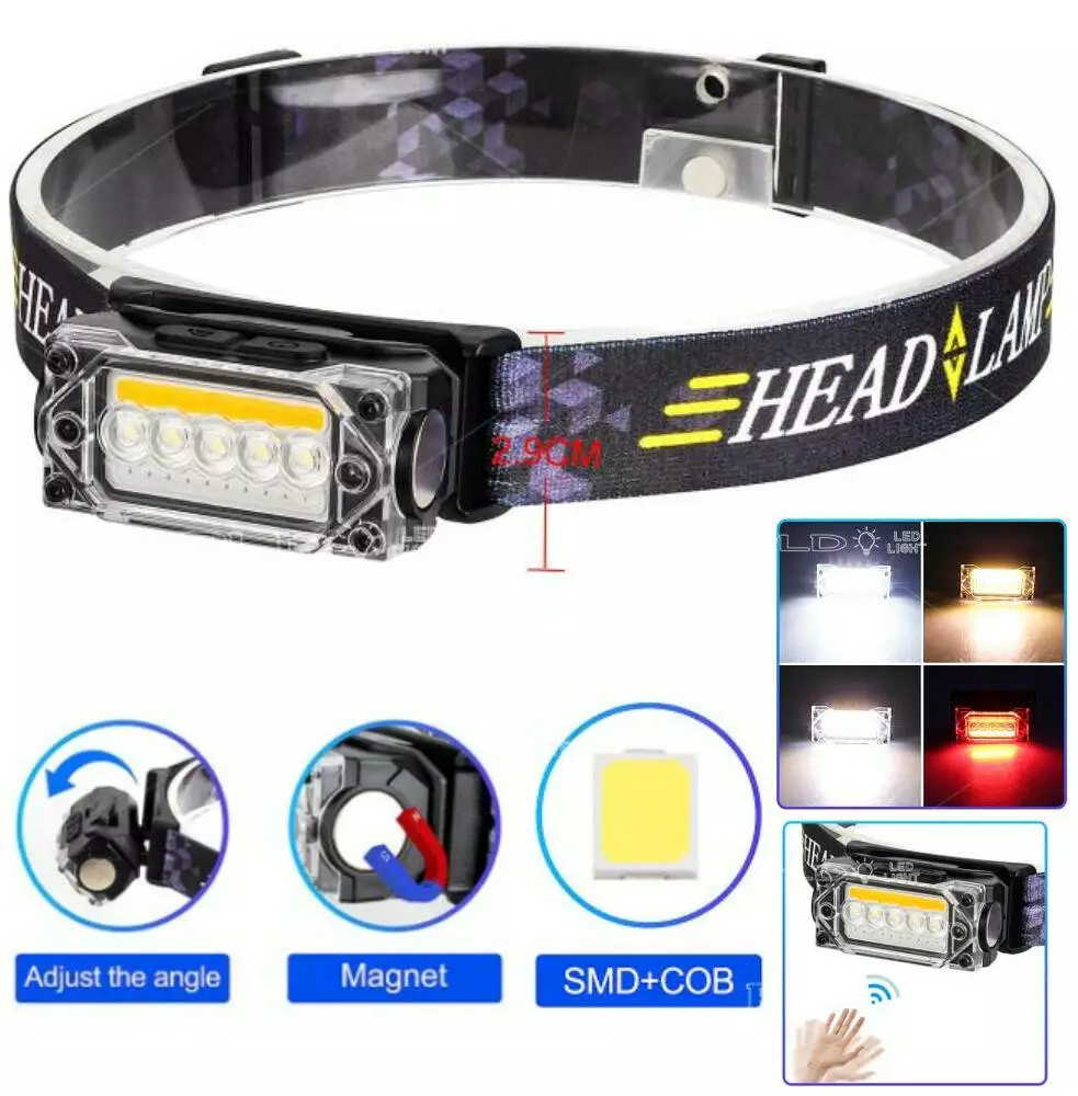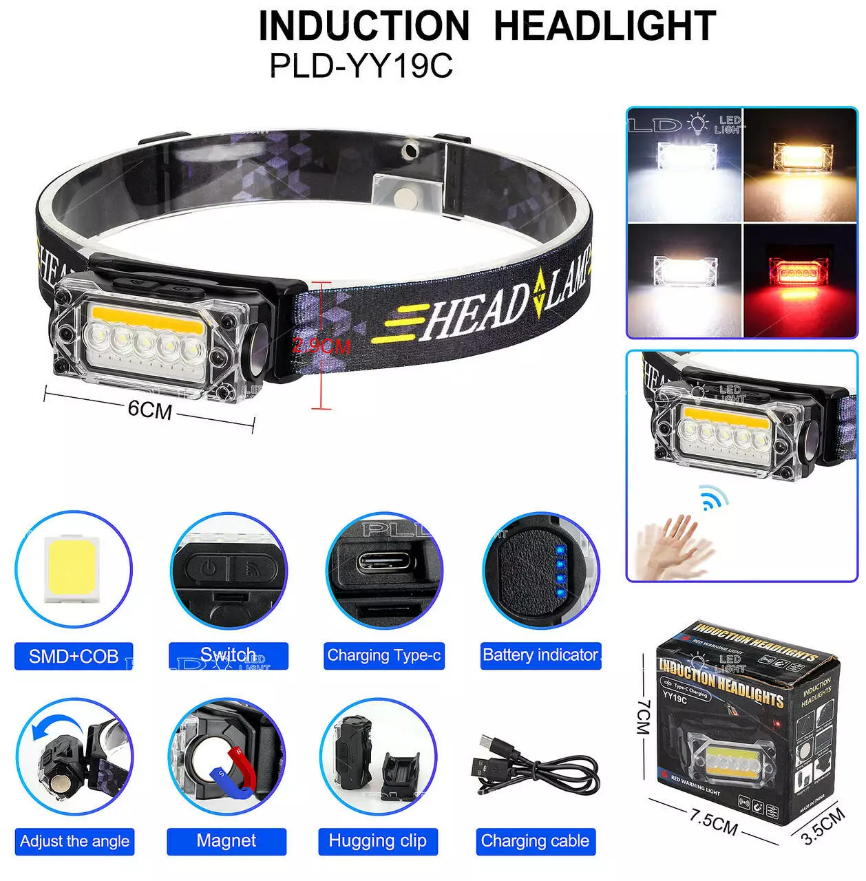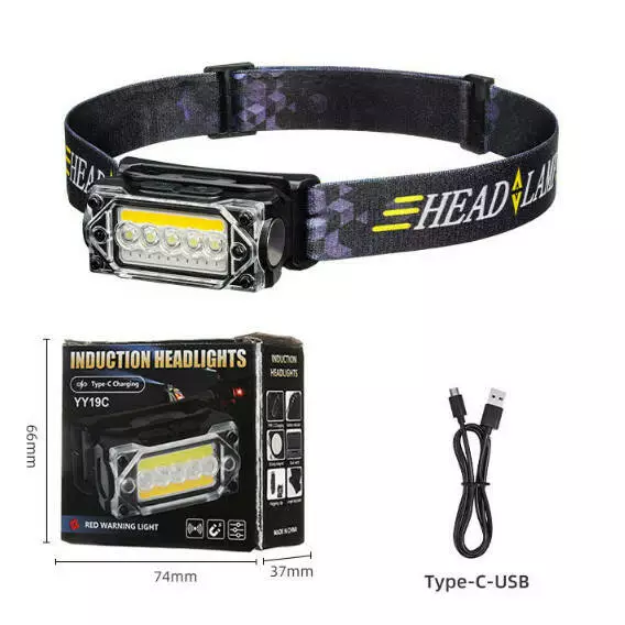 Ліхтар налобний YY-19С-5SMD+COB(white+yellow+red), Motion Sensor, Li-Ion акумулятор, ЗП Type-C, магніт, Box