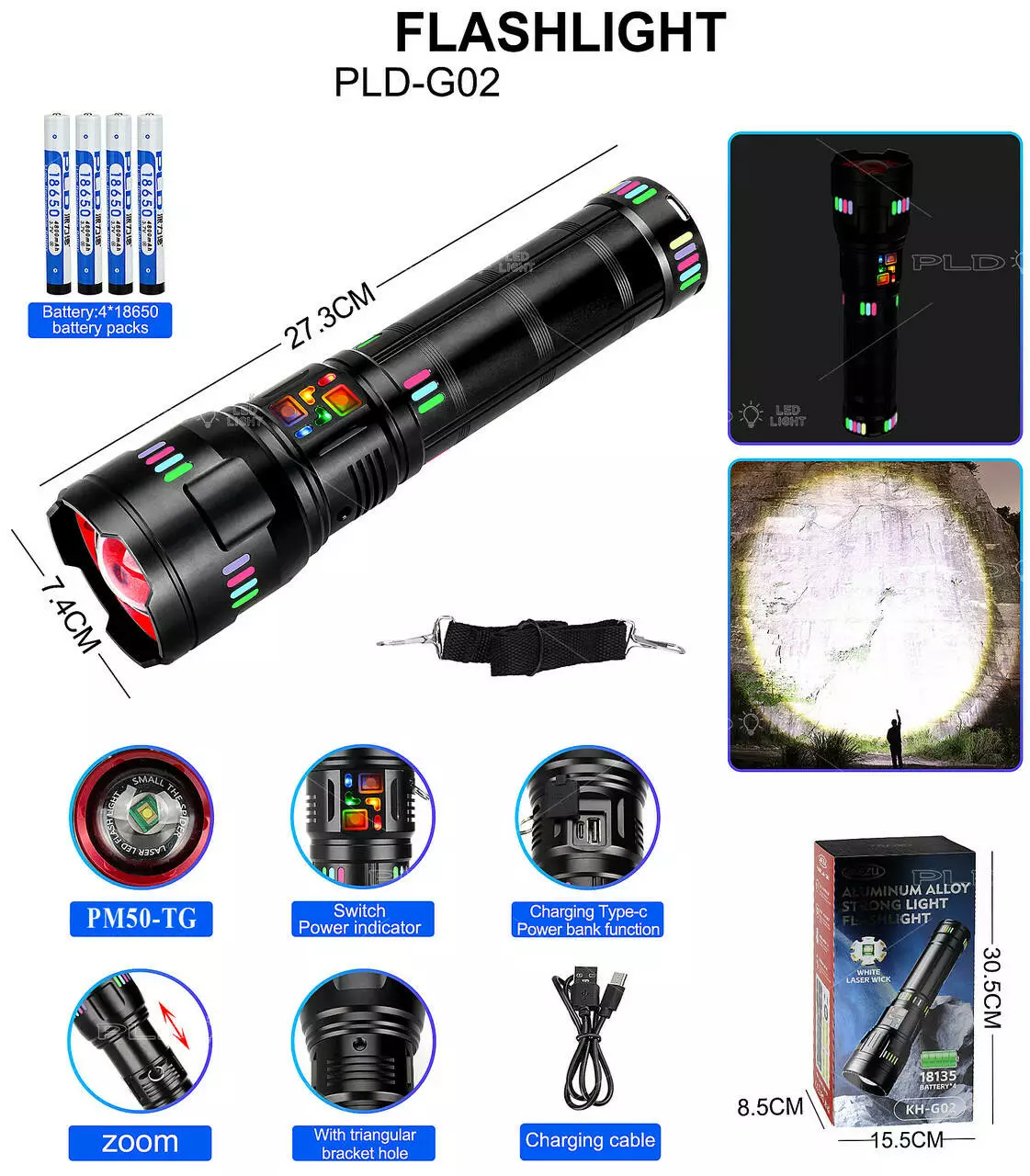 - Комплектация: фонарь, 4х181350 аккумулятора 3.7V, кабель USB-Type-C