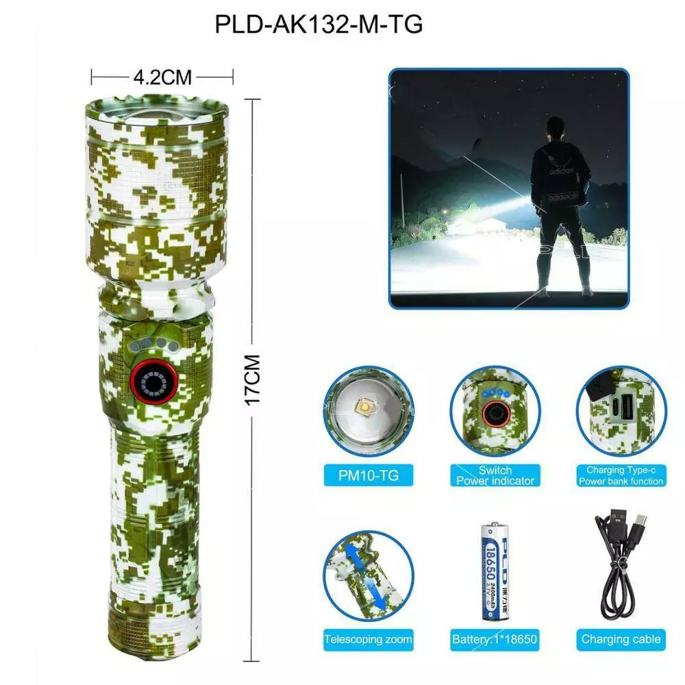 Ліхтар PLD-AK132M WHITE LASER LED PM10-TG camouflage, 1х18650, Power Bank, індикація заряду, ЗП Type-C, zoom, Box