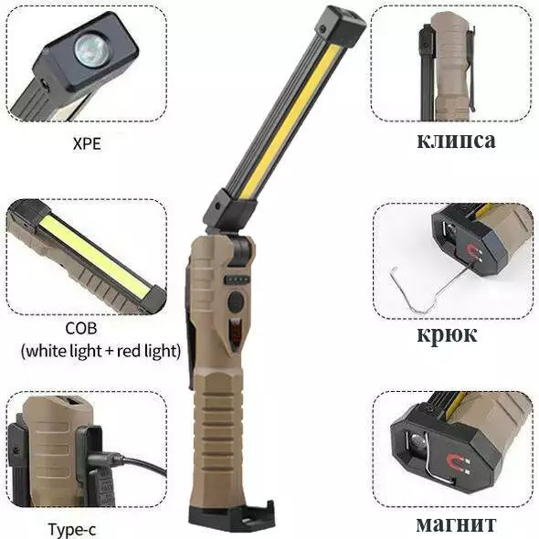 Додаткові характеристики: індикація заряду батареї, гачок, магніт, обертання лампи на 180 градусів