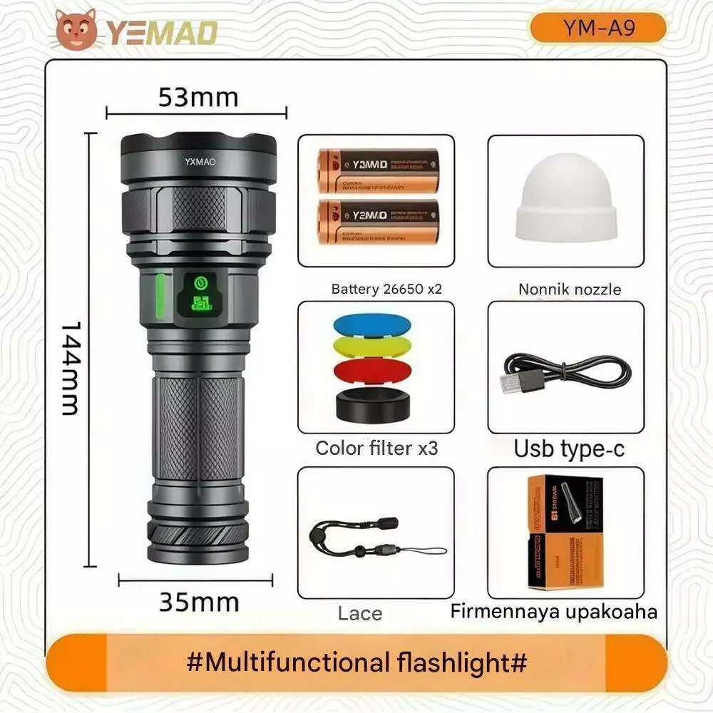 Ліхтар YEMAO YM-A9 9LED, 2x26650, Power Bank, ЗУ Type-C, ковпачок, 3 фільтри