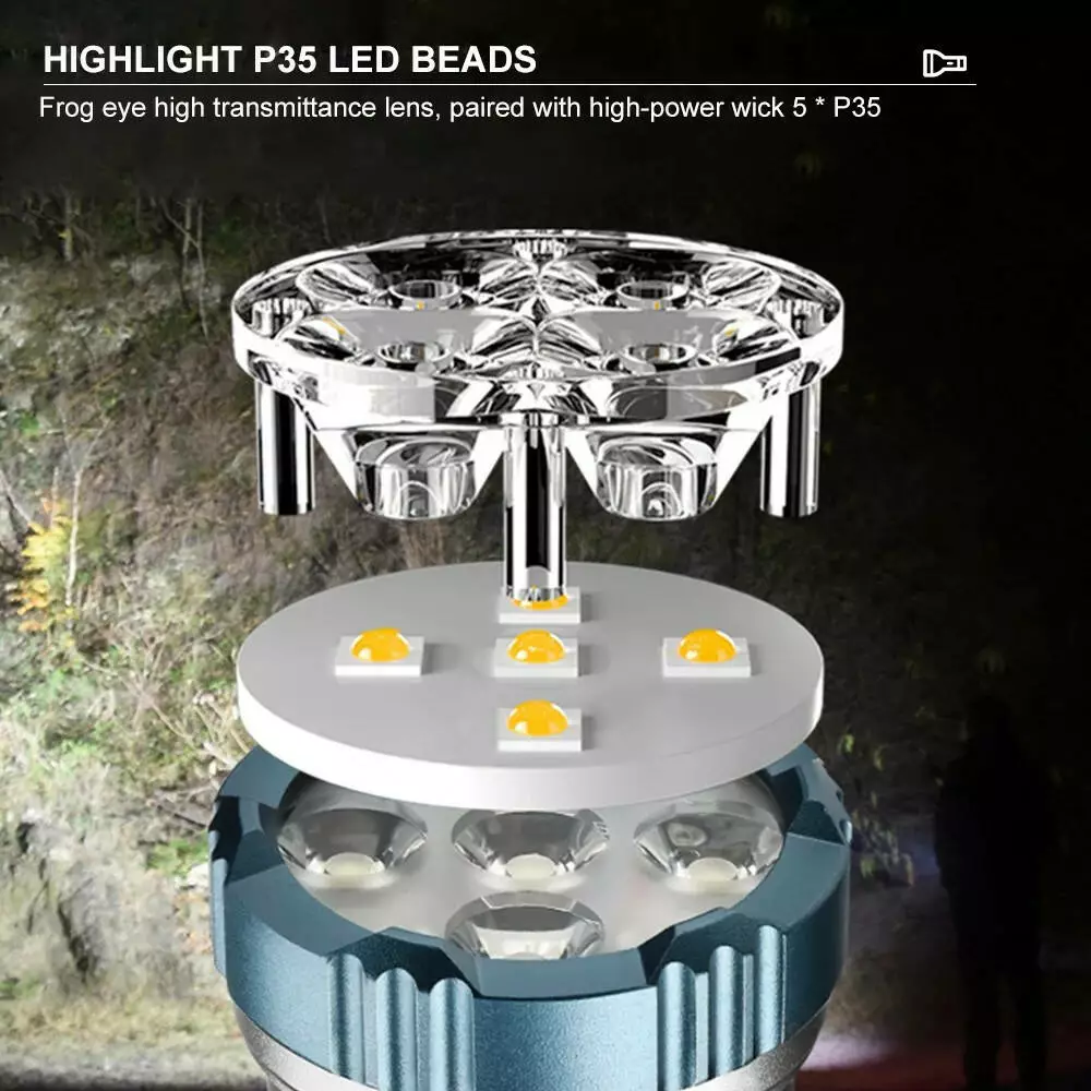 - Количество режимов работы: 5P35 5 (100%, 75%, 50%, стробоскоп, SOS), 4LED 3 (RED, BLUE,RED, BLUE стробоскоп)