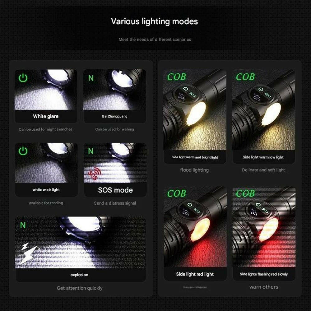 - Количество режимов работы: 5 TG (100%, 50%, 25%, стробоскоп, SOS), 4 COB(Yellow 100%, Yellow 50%, Red, стробоскоп Red)