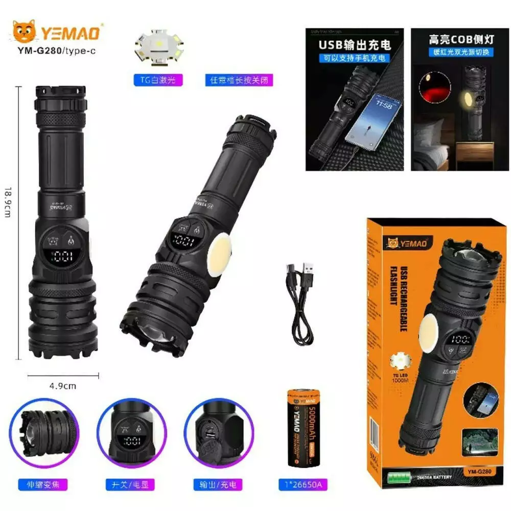 Ліхтар YEMAO YM-G280 TG+COB(Yellow+Red), 1x26650, Power Bank, ЗУ Type-C, zoom