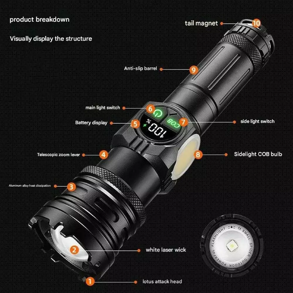 - Комплектация: фонарь, 1x26650 аккумулятор, USB кабель для зарядки