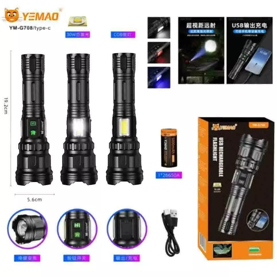 Ліхтар YEMAO YM-G708 TG+COB(White+Red), 1x26650, Power Bank, ЗУ Type-C, zoom
