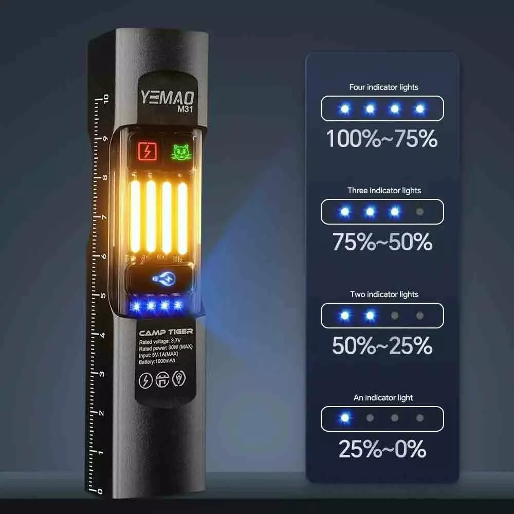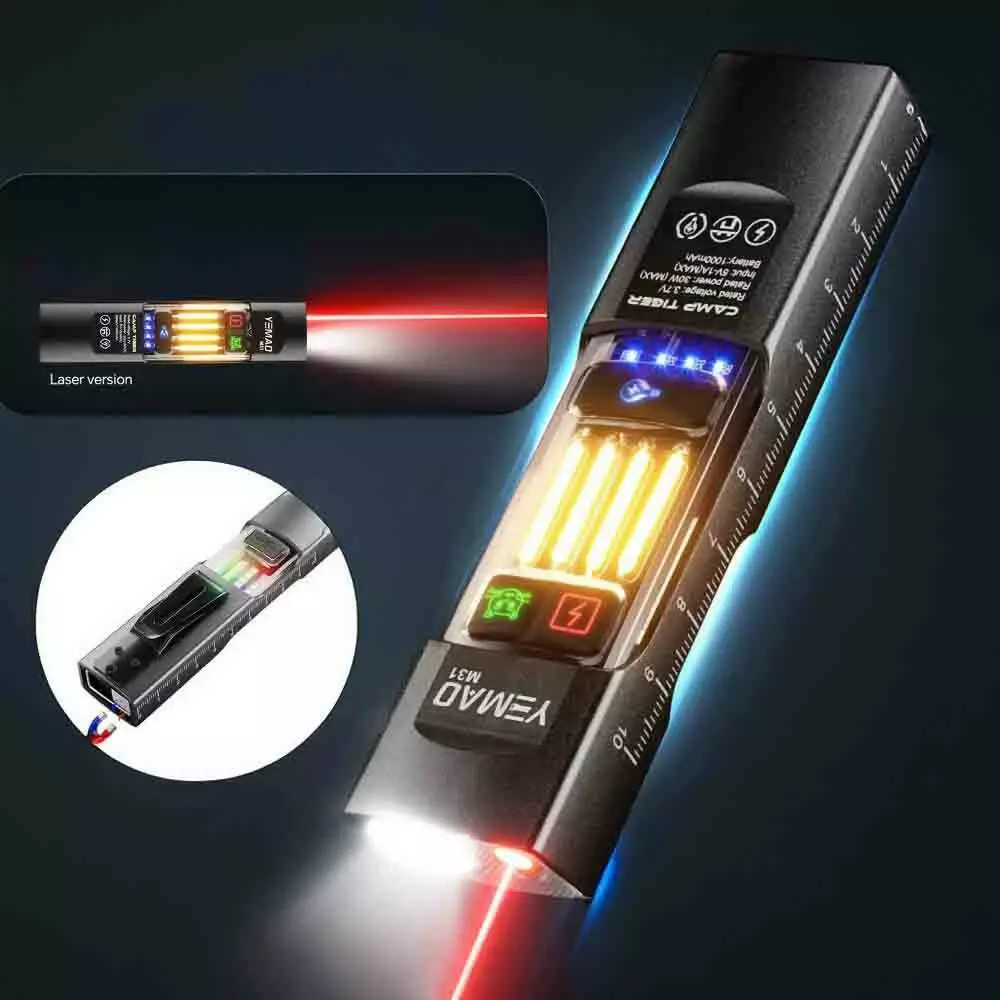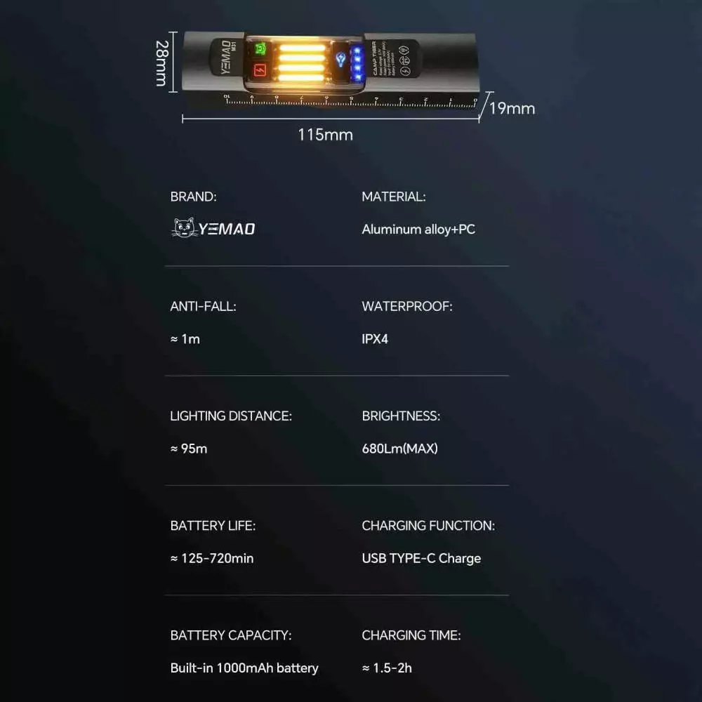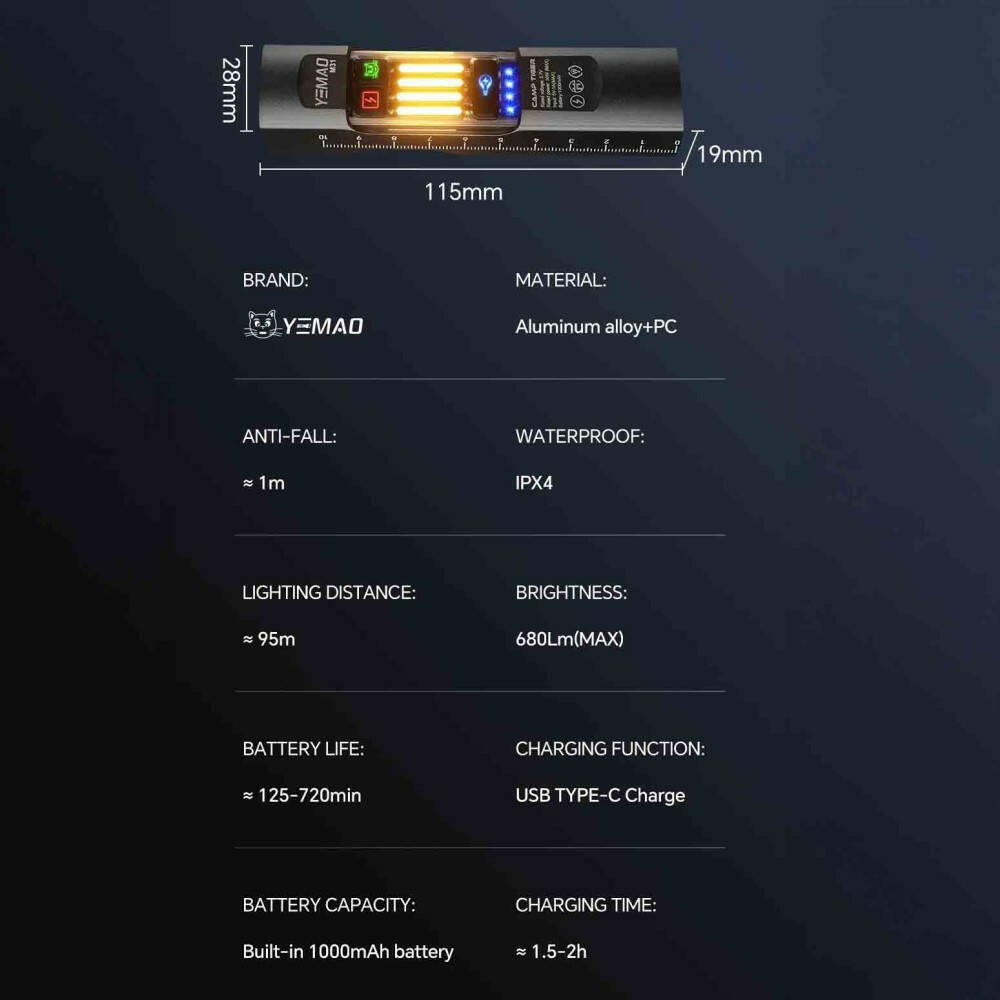 Додаткові характеристики: магніт, гак для підвішування, металева кліпса, міцний вологозахищений корпус, лінійка на корпусі, індикація заряду