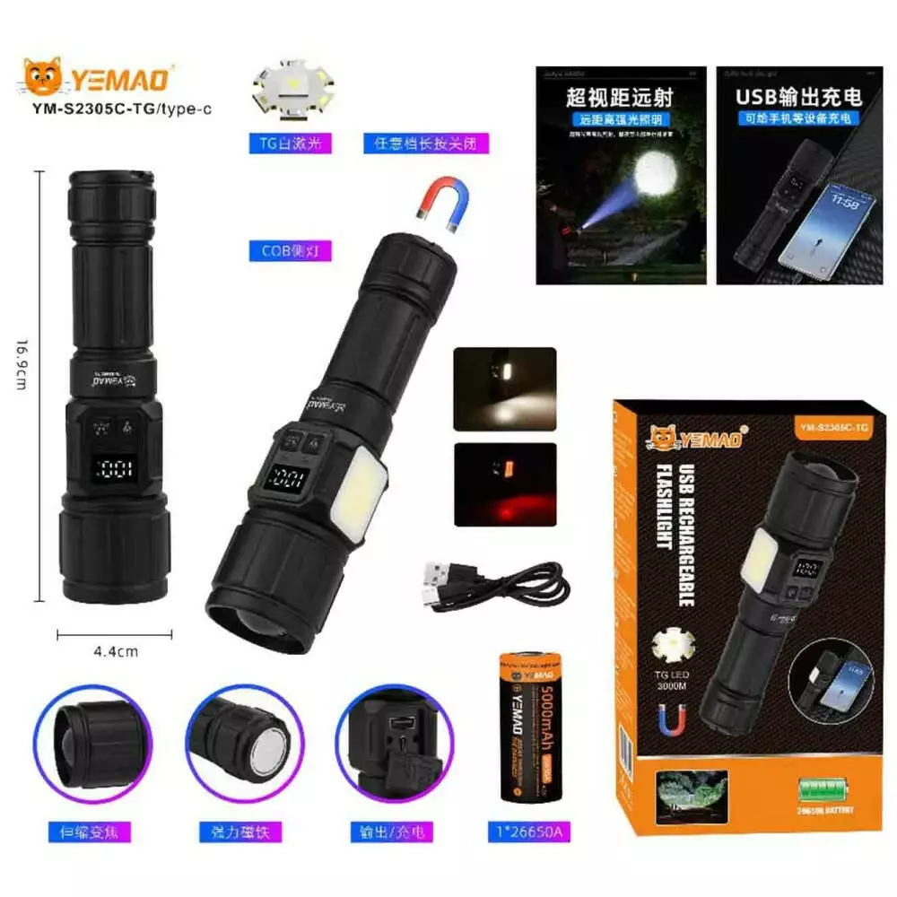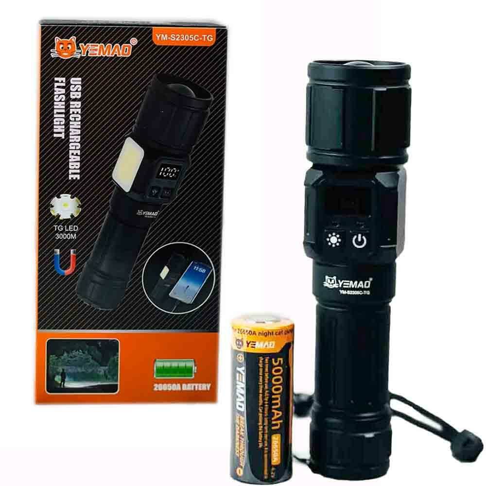 Ліхтар YEMAO YM-S2305C TG+COB(White+Red), 1x26650, Power Bank, ЗУ Type-C, zoom, магніт