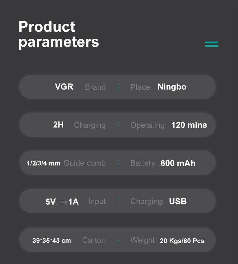 - Довжина стрижки: регулюється змінними насадками - в комплекті 4 насадки, для 1 мм, 2 мм, 3 мм та 4 мм.