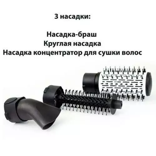 - Три змінні насадки: щітка-браш (23 мм, 26 мм) та плойка-бігуді (13 мм)