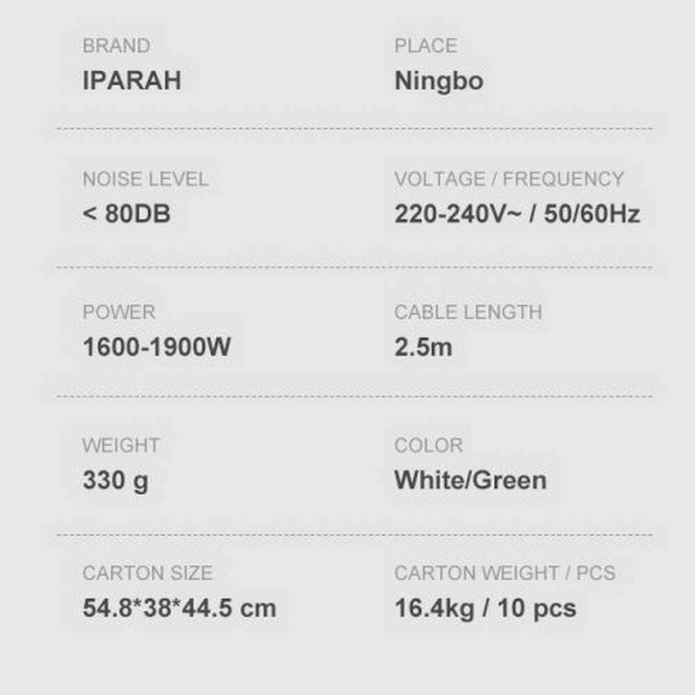 Професійний фен IPARAH P-385G GREEN, 3 рівні обдування, 3 рівні температури, 1600-1900W