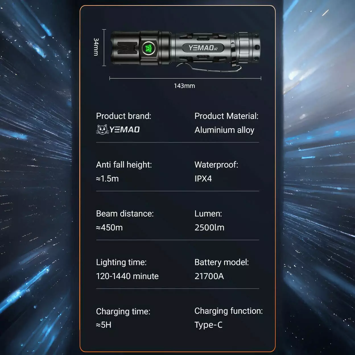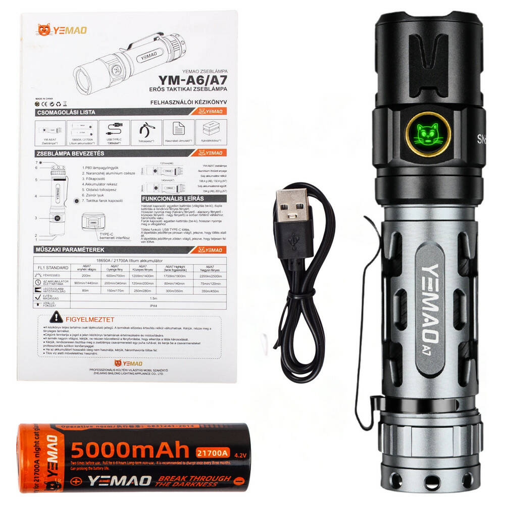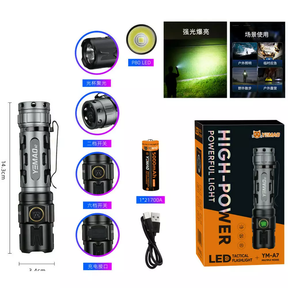 Тактичний ліхтар YEMAO YM-А7, 2200LM, акумулятор 21700 (5000 mAh)