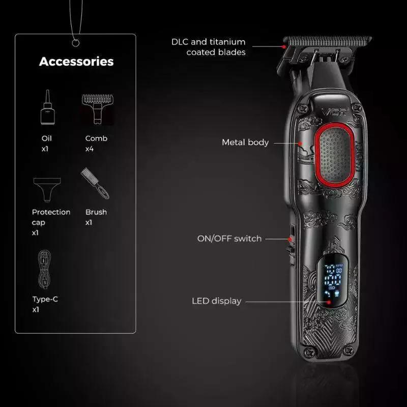 Тример VGR V-254 RED, 4 насадки, 7000 RPM, 2000 mAh, LED display