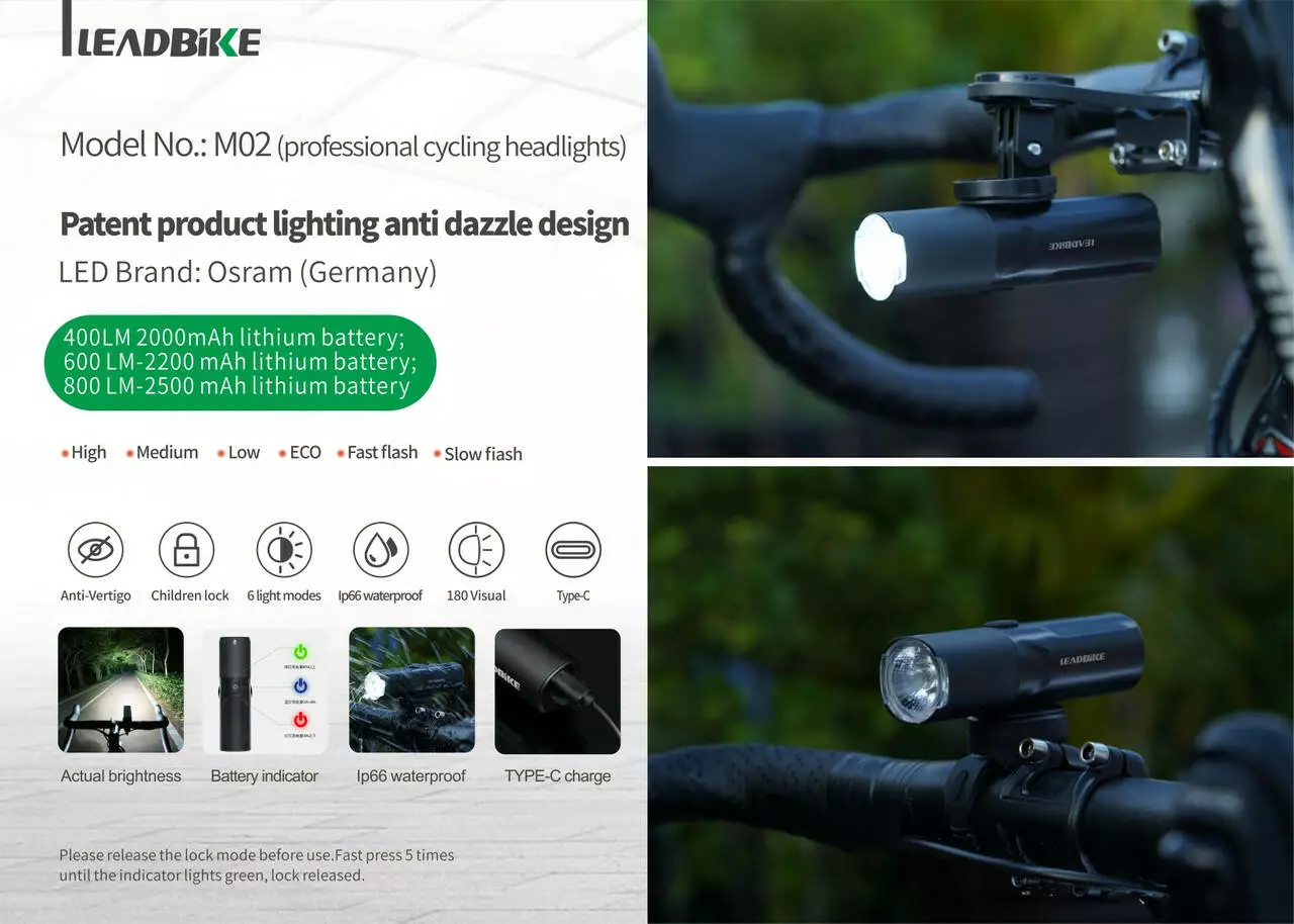 Велофара потужна LEADBIKE M02-OSRAM 400LM, 2000mAh, waterproof, children lock, Li-Ion акумулятор, ЗП Type-C