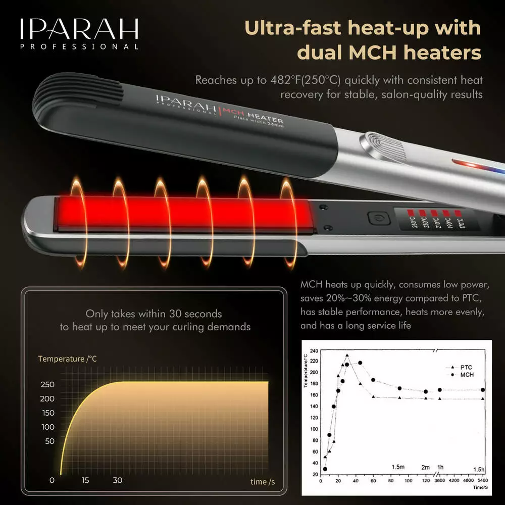 Професійний електричний випрямляч волосся IPARAH P‑132 Professional MCH Keratin Electric 170‑250℃ Hair Straightener Flat Iron — це потужний та функціональний прилад для створення ідеально гладкого та доглянутого волосся. Пристрій оснащений високоефективним MCH-нагрівачем і нагрівальними пластинами з кератиновим покриттям, які забезпечують швидке і рівномірне прогрівання і дозволяють досягти стійкого результату за один прохід. Діапазон регульованої температури 170-250 ° C допомагає підібрати оптимальний режим для різних типів волосся. Наочний LED-індикатор спрощує контроль налаштувань, а кабель, що обертається на 360°, робить використання максимально зручним. Випрямляч підходить як для домашнього застосування, так і для професійного стайлінгу в салоні.
